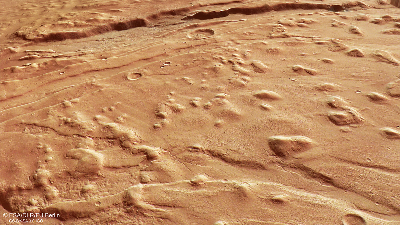 August 2025. Aktuelle Bilder der hochauflösenden Stereokamera HRSC zeigen den westlichen Teil des riesigen Grabensystems Acheron Fossae auf dem Mars. HRSC ist ein Kameraexperiment, das vom DLR entwickelt wurde und auf der ESA-Mission Mars Express betrieben wird. Die Region im Blickfeld der Kamera befindet sich etwa 1.200 Kilometer nördlich von Olympus Mons – dem höchsten Vulkan in unserem Sonnensystem.