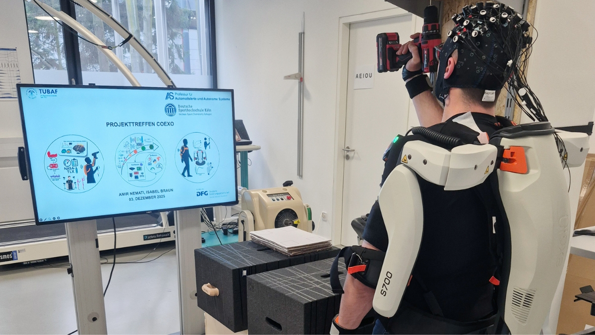 März 2026. Exoskelette gelten als vielversprechende Technologie, um körperlich belastende Tätigkeiten in Industrie und Handwerk zu erleichtern. Doch wie wirkt sich ihr Einsatz auf Aufmerksamkeit, Bewegungskoordination und Leistungsfähigkeit aus? Dieser Frage widmet sich das neue Forschungsprojekt „CoExo – Kognitiv-motorische Interferenzen beim Exoskeletteinsatz“, das von der Deutschen Forschungsgemeinschaft (DFG) gefördert wird.
